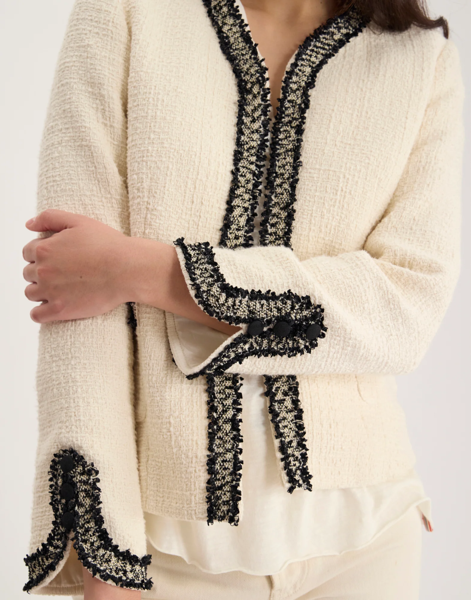 La nouvelle veste Misia a déjà tout d'un grand classique. Particulièrement élégante tout en étant très confortable, sa coupe droite est soulignée d'un galon, posé à la main dans les traditions d'un savoir-faire sophistiqué, qui lui confère une allure irrésistible. Sobre mais habillée, elle est parfaite en journée ou en soirée, elle habille toutes les silhouettes et reste toujours glamour. Elle représente à merveille l'élégance à la Française.Veste Misia