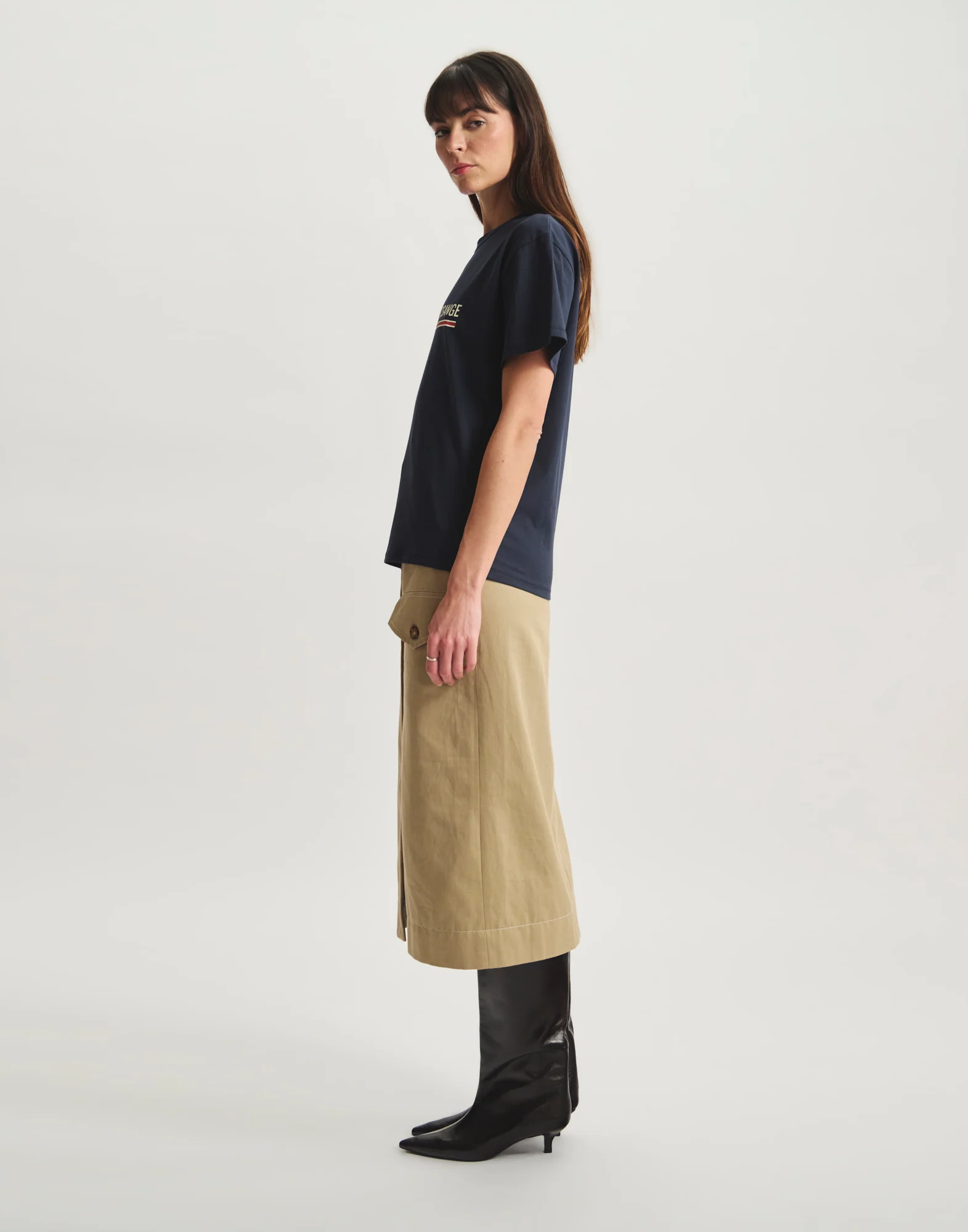 Voici le tee-shirt Maxence, un joli top manches courtes fabriqué dans un mélange de coton organique et coton recyclé, ici proposé en bleu marine.