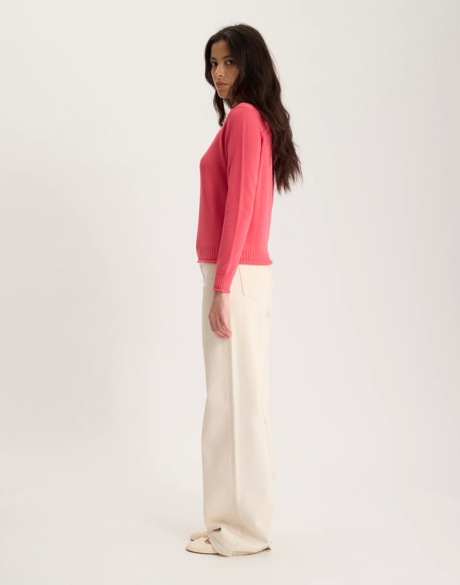 Épuré et raffiné, le pull Angelica est décliné ici dans un coton 100% Bio. Sa coupe sobre à col rond est relevée par des finitions roulottées aux poignets et à la base, pour une délicate touche d'élégance . Un essentiel chic, confortable et durable.Pull Angelica